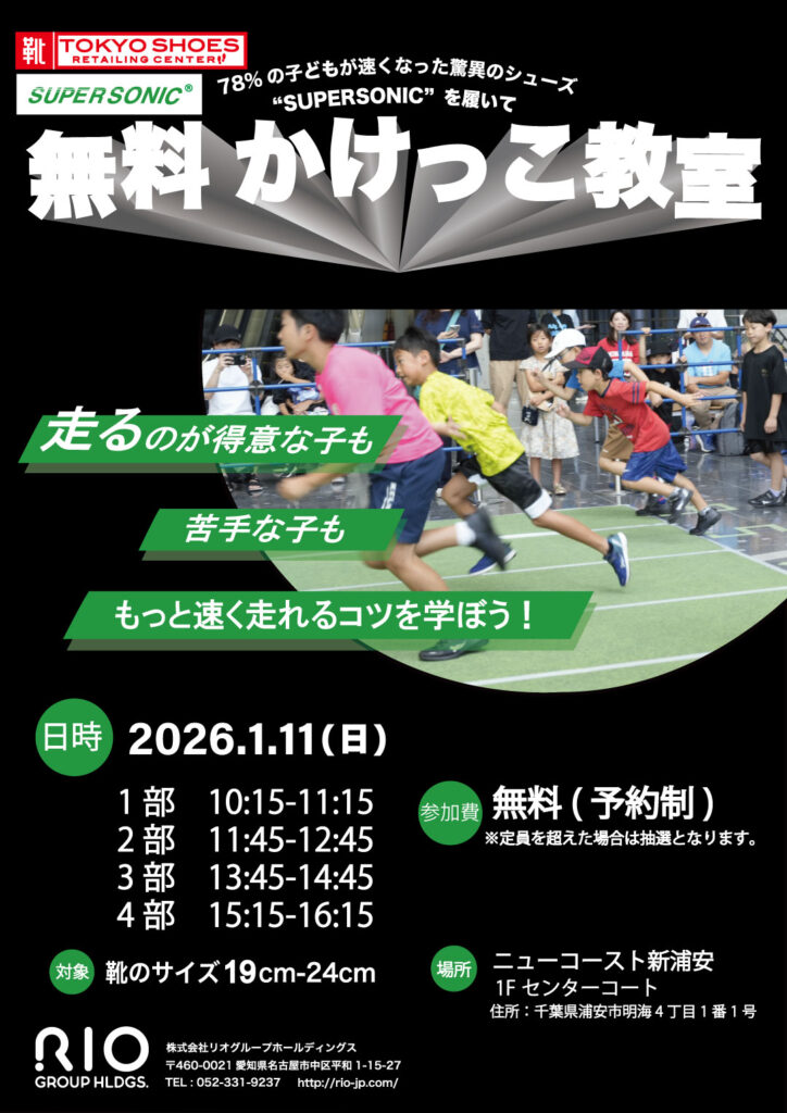 靴底にグラスファイバープレートを搭載した当社の子供靴「SUPER SONIC」を試せるかけっこ教室を開催します。