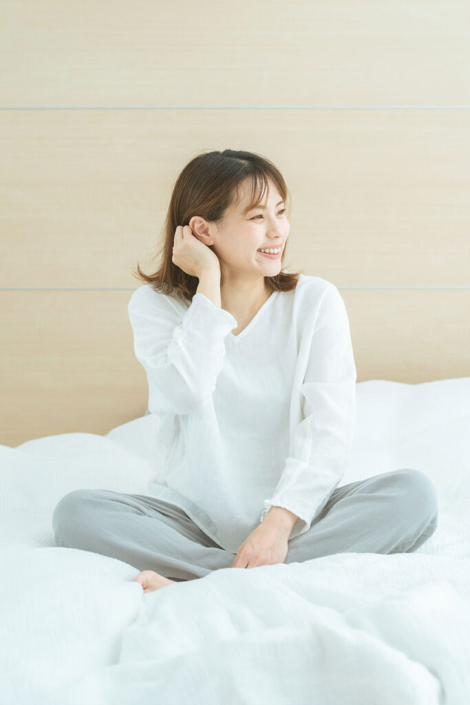 綿100%のダブルガーゼにシアバター、オリーブオイル、シルクアミノ酸の三つの天然由来成分を配合した保湿加工が特徴で、肌の乾燥を防ぎ快適な眠りをサポートしています。